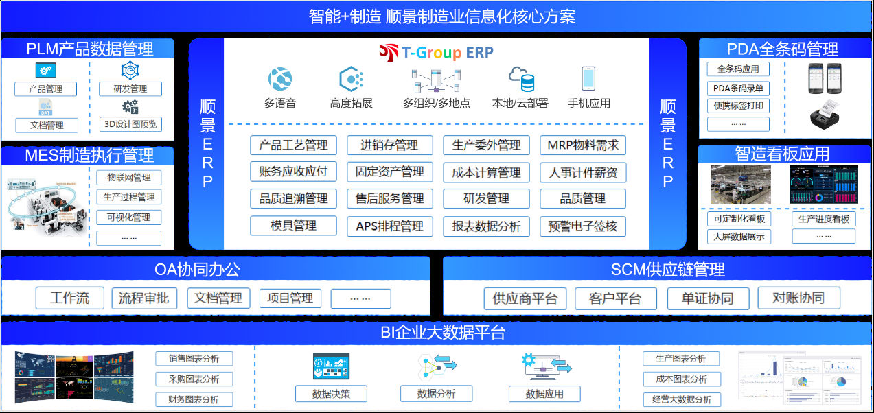 順景ERP系統,以制造為核心,將制造企業最核心的生產管理需求與供應鏈管理、財務管理相結合完美結合,打造以生產計劃為核心的全程一體化管理體系,打破各部門、各環節、各系統之間溝通和協作的壁壘,建立規范、靈捷、高效的業務流程,實現銷售、PMC、采購、倉庫、品質、人資、財務、工程技術部門等所有環節全程無縫管理,確保了數據信息在傳遞過程中的準確性、時效性和有效性,幫助企業快速反應、緊密協作、良好運營,更快推進業務發展,全面提升核心競爭力。