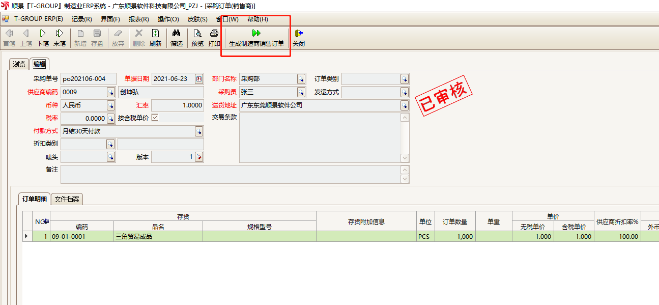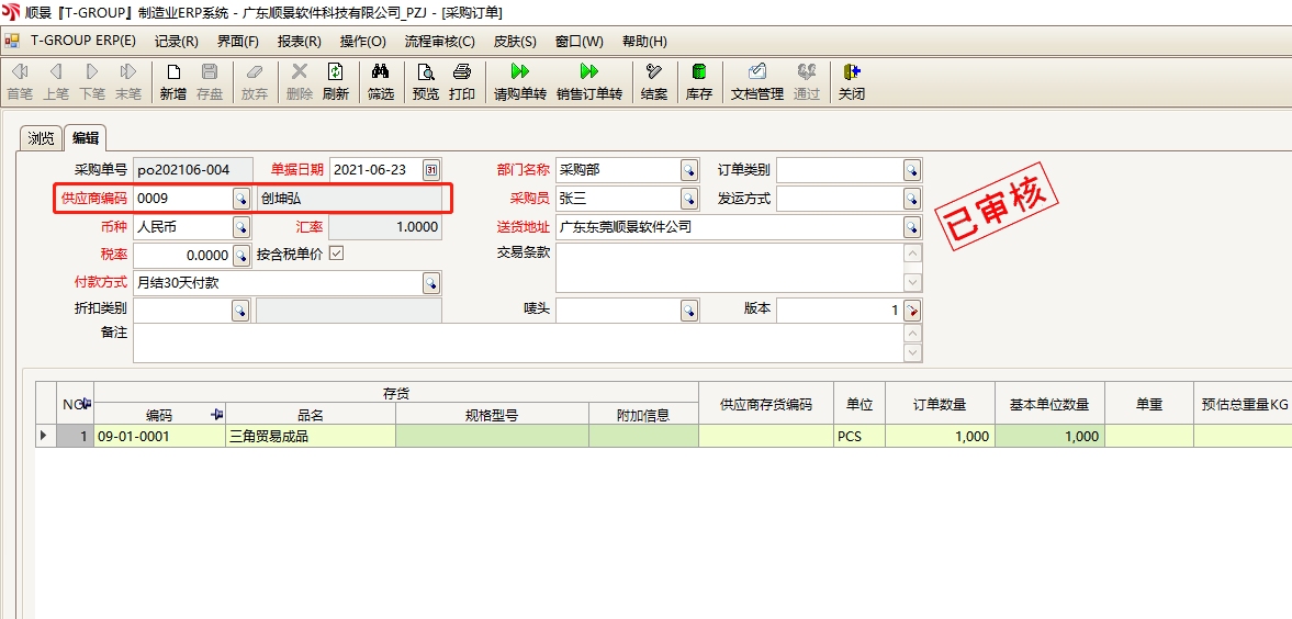 5.現(xiàn)在順景ERP內(nèi)就會自動在A公司庫內(nèi)生成一張采購訂單。