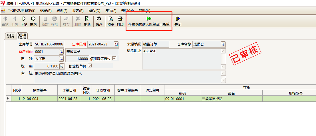 12. 選擇該出貨單,點擊生成銷售商入庫單及出庫單。