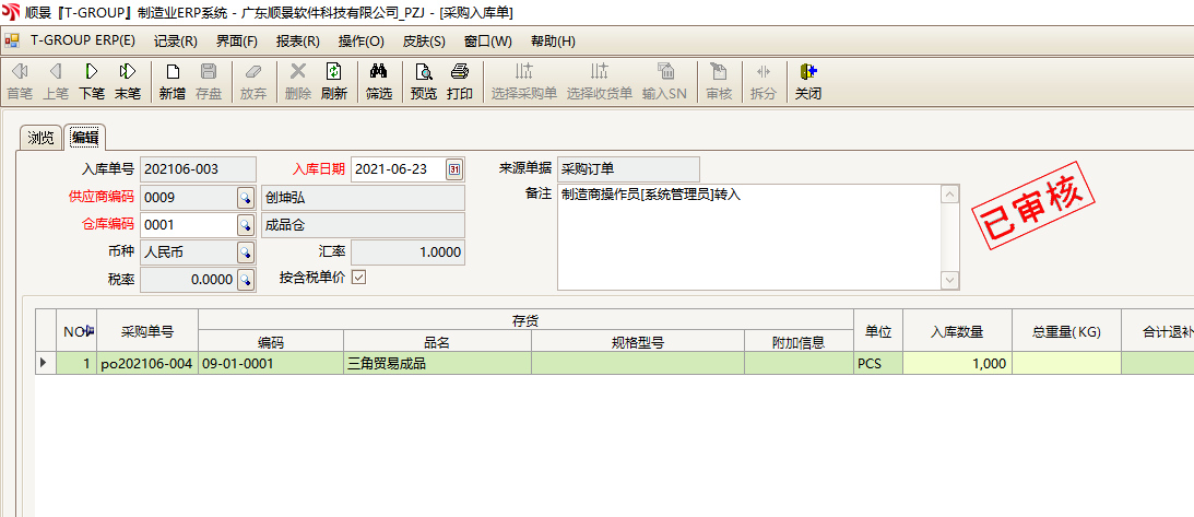 13.此時A公司的庫內(nèi):就會自動生成一張采購入庫單,為步驟5內(nèi)采購訂單的入庫單。