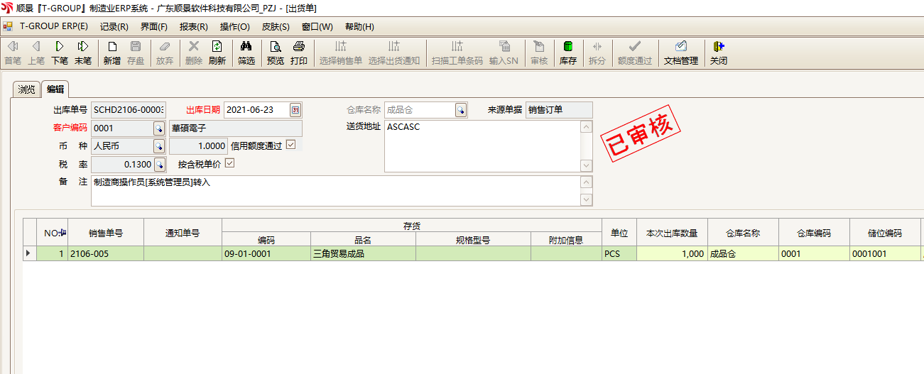 14.此時A公司的庫內(nèi):也會生成一張出貨單,為步驟1內(nèi)(下單客戶)的銷售訂單的出貨單。