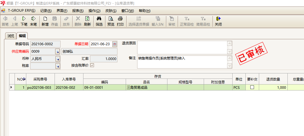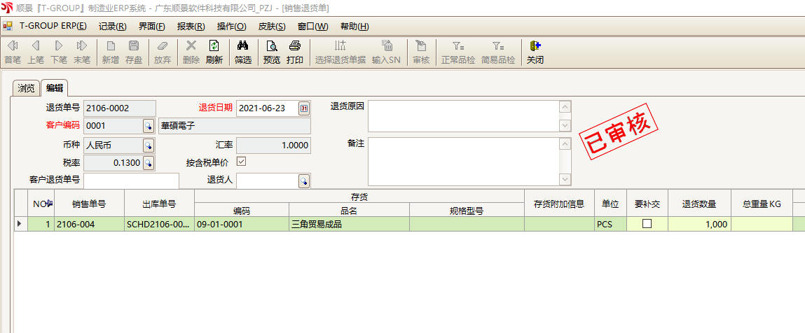 17.B公司庫內(nèi)就會生成步驟9:銷售訂單(客戶為A公司)的銷售退貨單。
