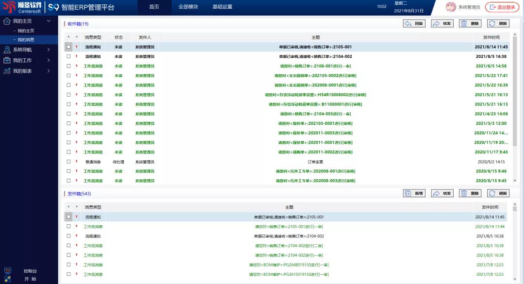 收件箱:接收ERP內系統消息及流程審批,以郵件的方式在此顯示,可雙擊收件信息進行回復、或轉發、刪除等功能