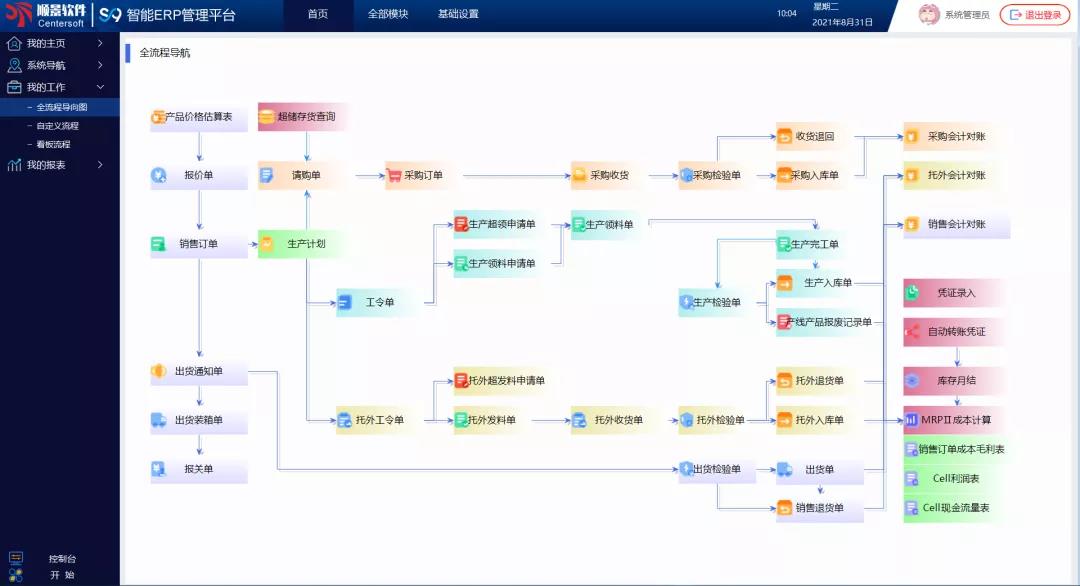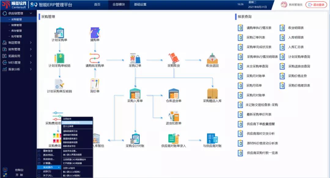 - 順景S9智能ERP系統,進行全新的布局優化,分為「供應鏈管理」、「制造管理」、「財務管理」、「拓展應用」、「MES管理」、「APS管理」六大應用模組