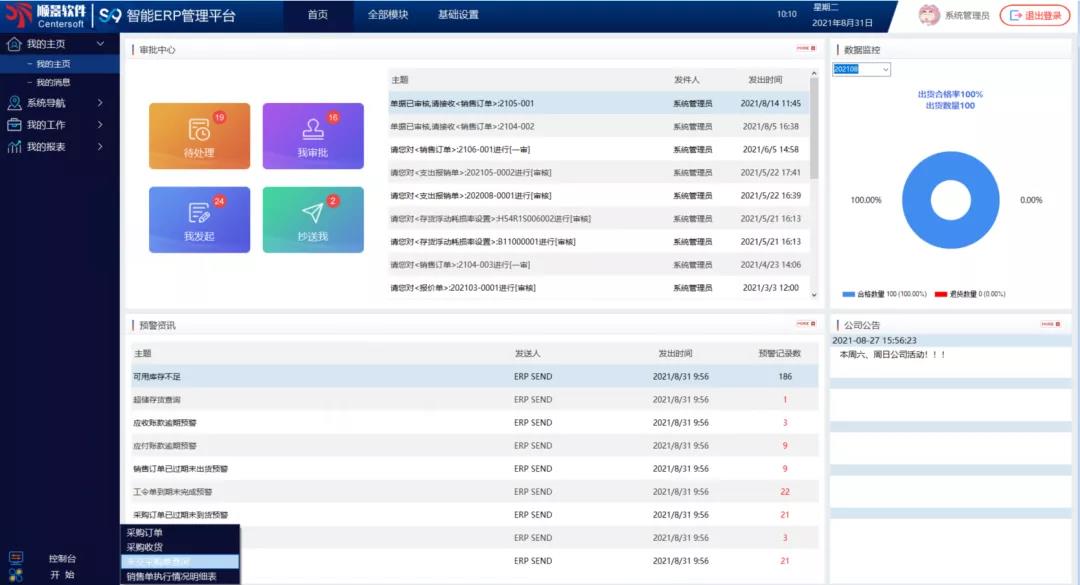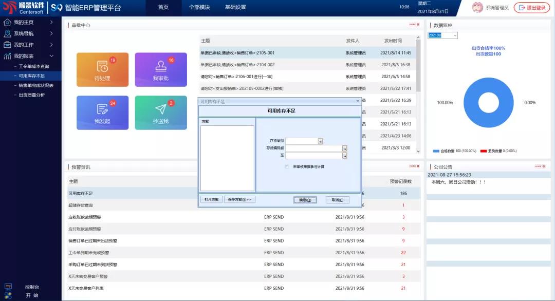 「預警平臺」:系統預警平臺,支持預警設置,可對ERP內重要數據進行實時監控,系統觸發條件預警