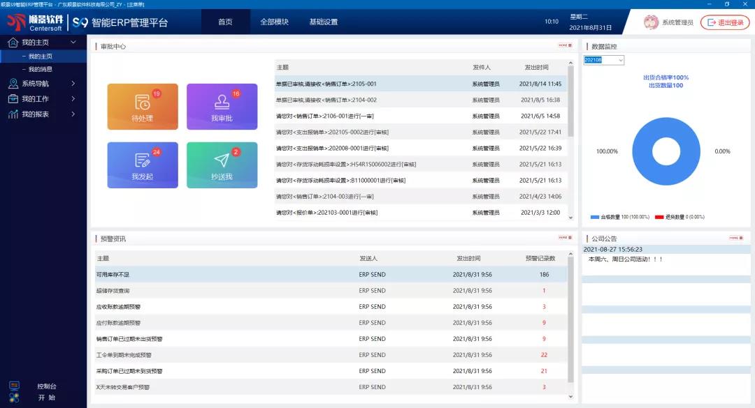 - 「我的主頁」目前分為四個區域,分別顯示:“審批中心”、“數據監控”、“預警資訊”、“公司公告”