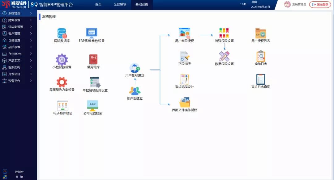 「基礎設置」分為:《系統管理》、《財務設定》、《供應商管理》、《客戶管理》、《倉儲設置》、《品質設定》、《存貨BOM》、《產品工藝》、《組織架構》、《開發平臺》、《預警平臺》模塊