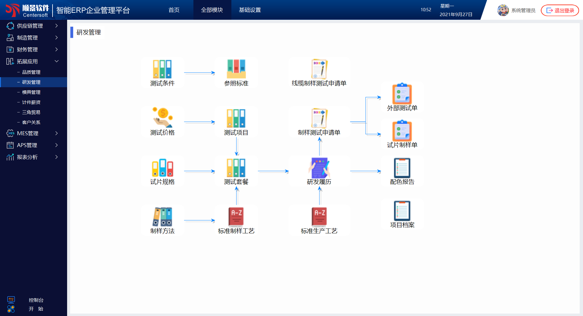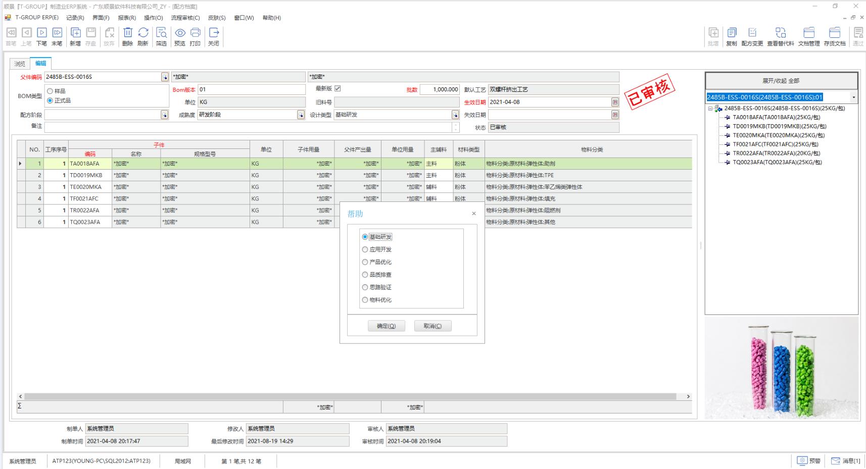 順景S9 ERP對于改性塑料工廠的配方研發過程進行了全程管理,從發起配方,到參與實驗的配方,配方輪次、優選配方、終審配方,以及制樣工藝、試片工藝、測試套餐,都進行了記錄和管理,這為研發部門提供了詳盡的研發履歷查詢,并累積形成研發配方庫、生產工藝庫。