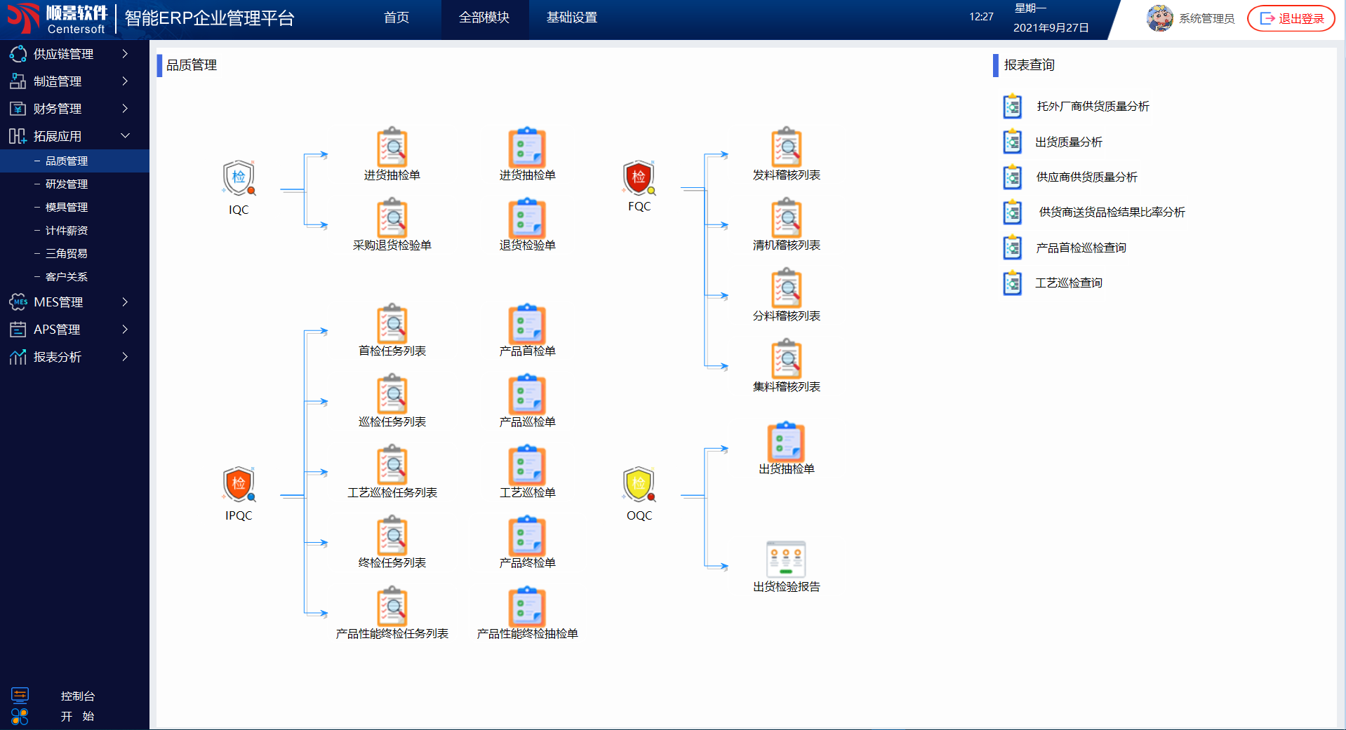 品質及生產過程監控,是順景S9 ERP另一管控重點;IQC來料檢驗,會由系統生成質檢工令單進行材料檢驗,材料從倉庫到配料房到攪拌、擠出的每一過程及位置移動,IPQC都會有稽核任務并回報稽核結果是否有異常,生產首檢、巡檢、工藝巡檢、產品性能終檢都在系統中進行記錄和監控,出貨后也有出貨檢驗報告生成。