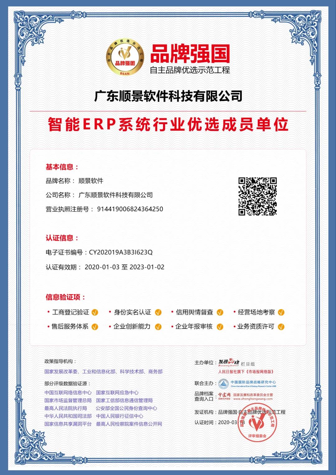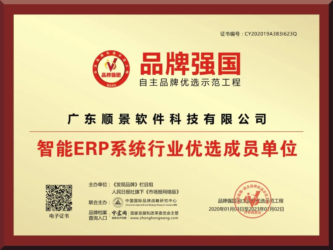 經(jīng)由品牌強(qiáng)國示范工程東莞地區(qū)運(yùn)營中心審核、認(rèn)證、社會(huì)公示,“順景軟件”符合示范工程評選標(biāo)準(zhǔn),成功入選為品牌強(qiáng)國示范工程智能ERP系統(tǒng)行業(yè)優(yōu)選成員單位,企業(yè)信息錄入品牌強(qiáng)國示范工程數(shù)據(jù)庫,在國家級平臺(tái)展示品牌形象。