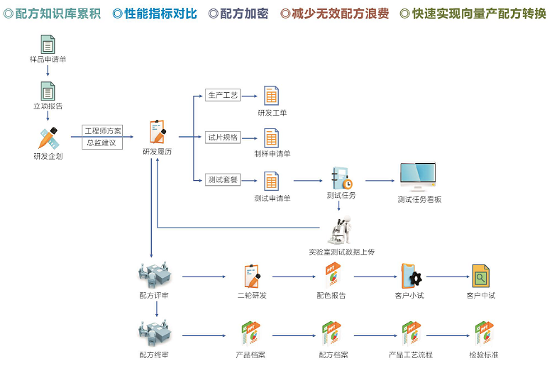 每個(gè)工程師只能看到參與的配方,防止數(shù)據(jù)外泄,配方從方案設(shè)計(jì)到下達(dá)任務(wù),制樣小組按工單進(jìn)行生產(chǎn)樣品,記錄樣品生產(chǎn)工藝、配色過程。